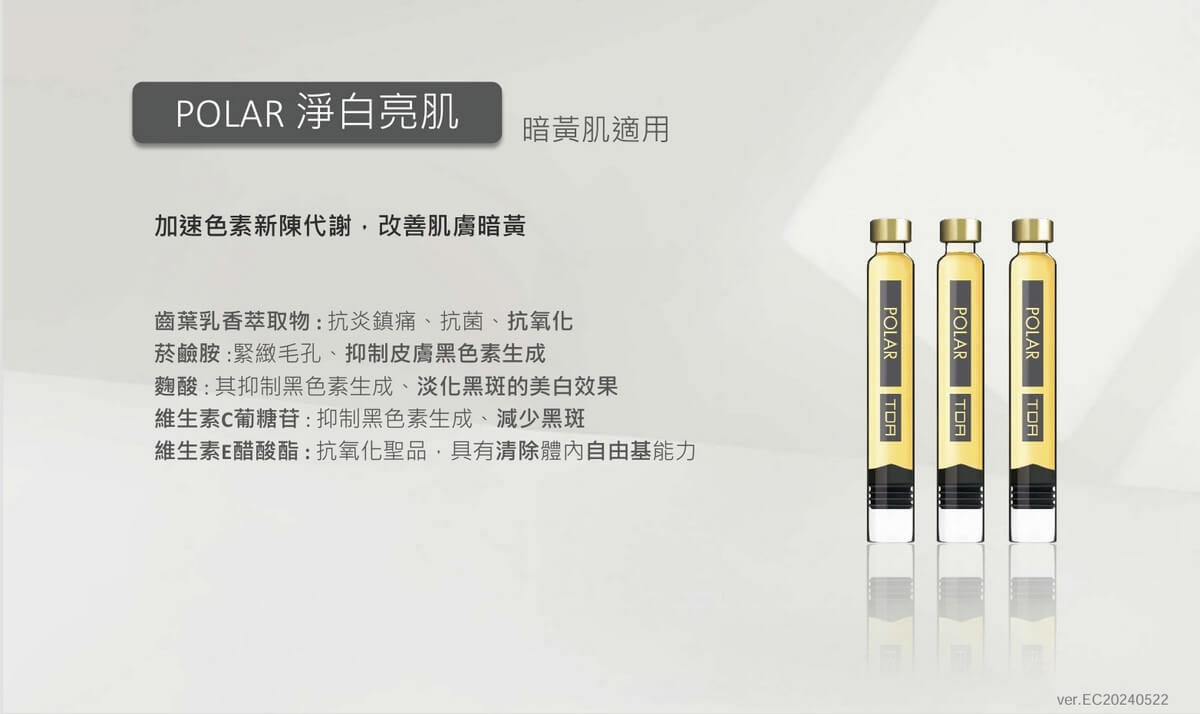 • POLAR 淨白亮肌 (暗黃肌適用) – 想要提亮肌膚,改善色素新陳代謝,改善肌膚暗黃
